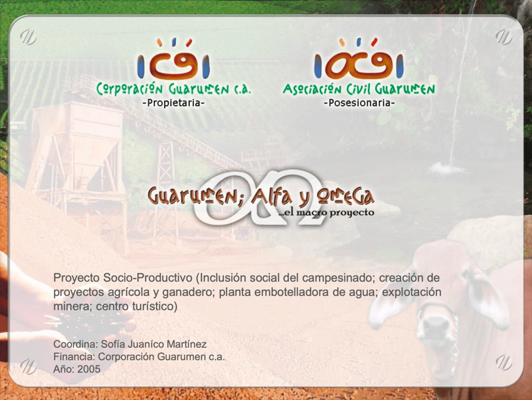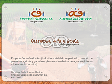2005. Guarumen: Alfa Y Omega fue un Proyecto Socio-Productivo, para la Inclusión social del campesinado de la zona; formación básica del campesinado y otros participantes; creación de proyectos agrícola y ganadero en favor del campesinado; planta embotelladora de agua, explotación minera y centro turístico (como medios de producción y auto financiamiento al objeto de poder sostener la acción social.